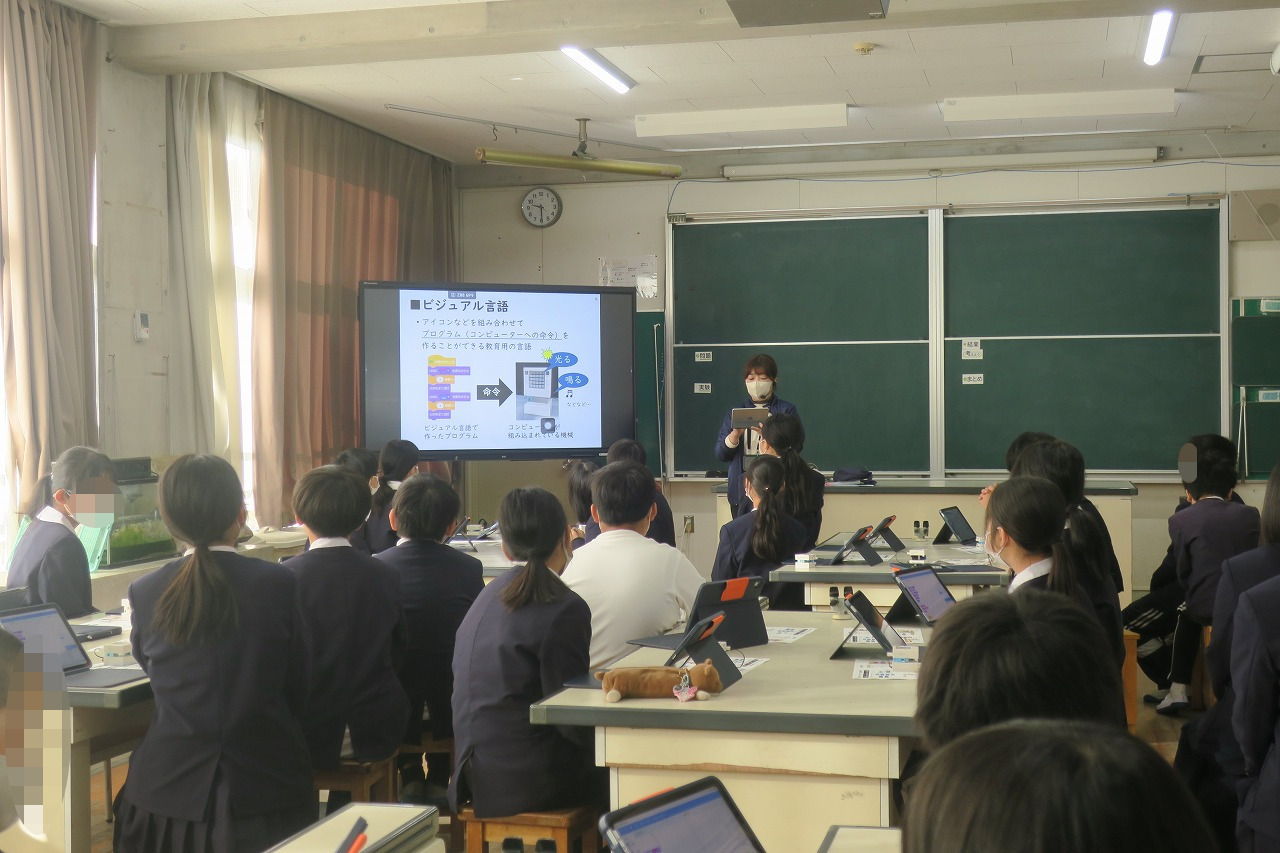 今回は、技術部から6名の職員が出向き、鹿児島市立郡山小学校6年生1クラス37名を対象に、理科室にて「信号機のプログラムをつくろう!」というテーマでプログラミングの授業を行いました。児童には1人1台ずつアーテックロボ2.0(株式会社アーテック)が準備し、タブレットを使ってロボットプログラミングを体験しました。前半は講義形式でプログラムの3つの基本処理(順次処理・繰り返し処理・分岐処理)を学び、後半は演習問題や自由制作に取り組みました。また並行して、班ごとにライントレースロボットの見学も行い、5班に分かれて順番に体験しました。教材にはレゴ・マインドストーム(株式会社LEGO)を使用しました。ライントレースカーは黒いラインに沿ってセンサーで黒と白を検知しながら車輪のモーターを左右に回転させて走行しており、児童たちはその仕組みを興味深く観察していました。