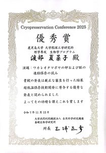 大学院理工学研究科生物学プログラム博士前期課程1年の渡部 夏菜子さんが、11月11日から12日に開催されたCryopreservation Conference 2025において、優秀発表賞を受賞しました。本カンファレンスは、生物の凍結保存技術についての成果発表や情報交換を行う会合であり、12回目の開催となる今回は、若手の大学院生や研究者による4名の口頭発表の中から研究内容の挑戦性、発表の明快さ、質疑応答が優秀と認められた1名に優秀発表賞が授与されました。