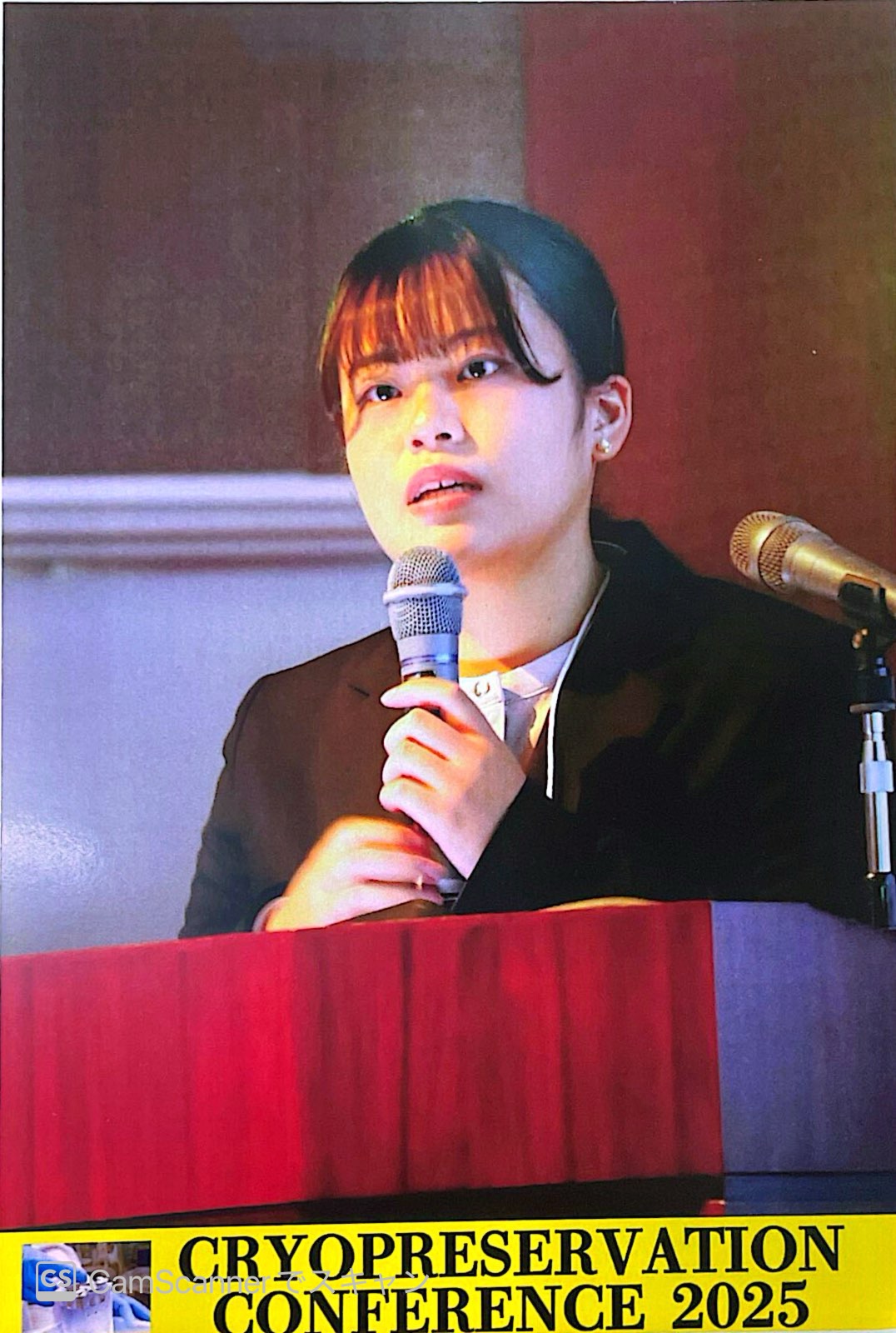 大学院理工学研究科生物学プログラム博士前期課程1年の渡部 夏菜子さんが、11月11日から12日に開催されたCryopreservation Conference 2025において、優秀発表賞を受賞しました。本カンファレンスは、生物の凍結保存技術についての成果発表や情報交換を行う会合であり、12回目の開催となる今回は、若手の大学院生や研究者による4名の口頭発表の中から研究内容の挑戦性、発表の明快さ、質疑応答が優秀と認められた1名に優秀発表賞が授与されました。
