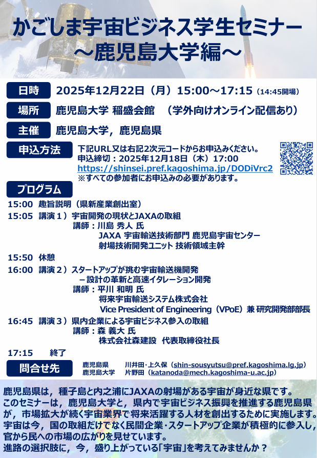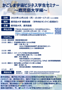 本学と県内で宇宙ビジネス振興を推進する鹿児島県が、市場拡大が続く宇宙業界で将来活躍する人材を創出することを目的として開催するものです。学生対象のセミナーですが、一般企業の方も聴講可能です。